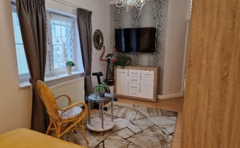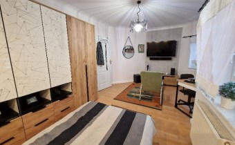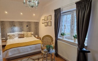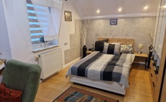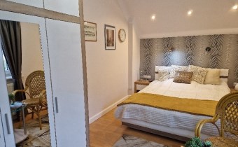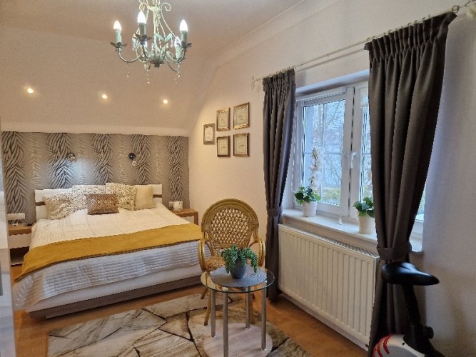 Druga oddzielna połowa domu: w tej części jest osobna łazienka, urządzona kuchnia , osobny pokój na poddaszu i duży salon na parterze z wyjściem do ogrodu. . Dzięki niewielkiej liczbie ścian działowych, łatwo można ją przekształcić w nowoczesne mieszkanie lub przestrzeń użytkową (biurową , gabinet kosmetyczny, fryzjerski, itp.)