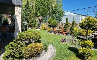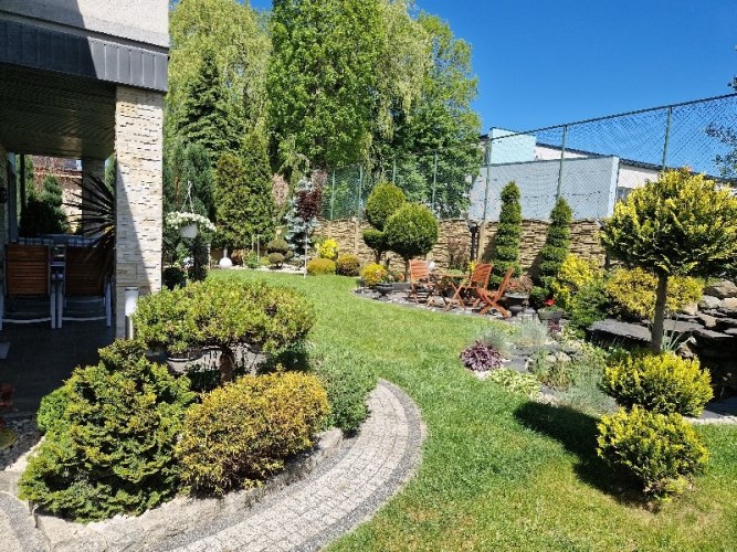 Działka wybrukowana, z tyłu zagospodarowana ozdobnymi roślinami, zapewniającymi prywatność i estetykę