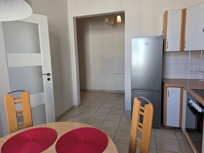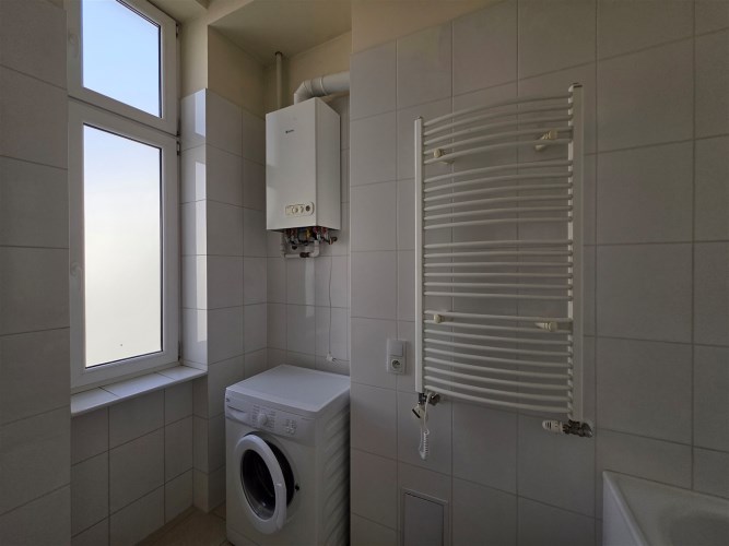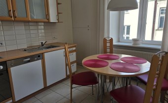 Przestronny układ obejmuje dwa duże pokoje, osobną kuchnię, pomieszczenie gospodarcze oraz balkon z widokiem na zielone podwórze.